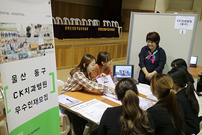 춘해보건대학교 치위생과 취업박람회에 올해도 동구 CK치과병원이 참가했어요~ 이번 취업박람회에는 작년과 마찬가지로 부울경에 위치하는 스무 곳의 치과병의원들이 함께 하는 자리였답니다.동구CK치과병원에서는 매년 해당 학교 출신인 치과위생사 1년차 선생님들이 직접 참여하는데, 올해는 김수정, 김나영 선생님이 함께 했어요. 1년차 선생님들이라 동구CK에서는 막둥이로 부둥부둥 마냥 귀엽기만 하다고 생각했는데, 학교에 가니 선배 포스가 팍팍!! 작년 같은 시기 같은 장소에서 경험을 했던 선배들이라 그런지 지원자들의 궁금한 점들에 대해서 눈높이에 맞춰 잘 설명해주었어요~