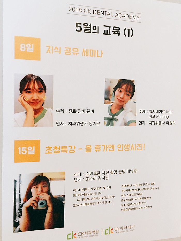 **2018년 동구 CK치과병원의 상반기 화요교육은 고연차부터 막둥이까지 자신만의 분야에서 이것만큼은 잘해요! 라는 분야를 쏙쏙 골라 동구CK가족들 모두 함께 지식을 나누고 노하우를 전하는 지식공유세미나로 진행하고 있습니다.