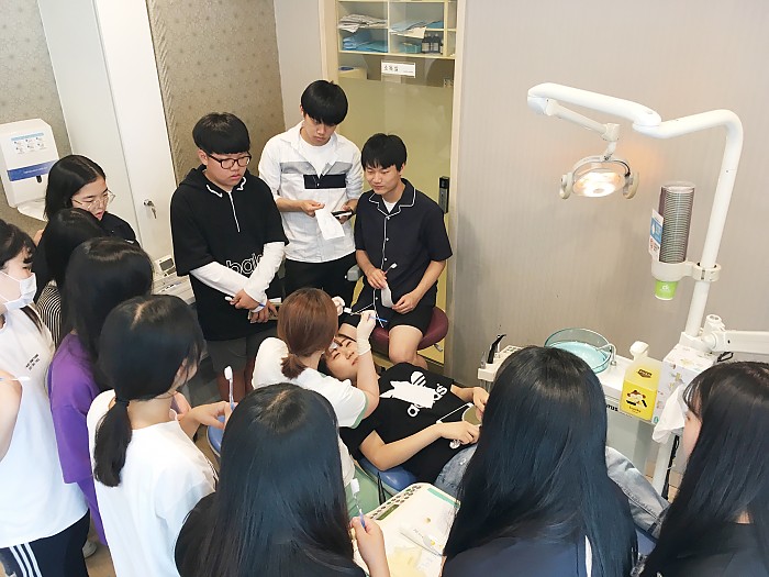 고등학교 학생 13명이 직업체험학습을 왔어요! (남목고, 방어진고, 화봉고, 화암고)예방팀 정혜선선생님이 동구CK치과병원에 대한 간략한 소개, 치과에서 일하는 치과의사, 치과위생사, 치과기공사 등 여러 직업군에 대한 내용과 함께 올바른 입속 관리 방법 등에 대해서 이론 교육을 진행했어요.