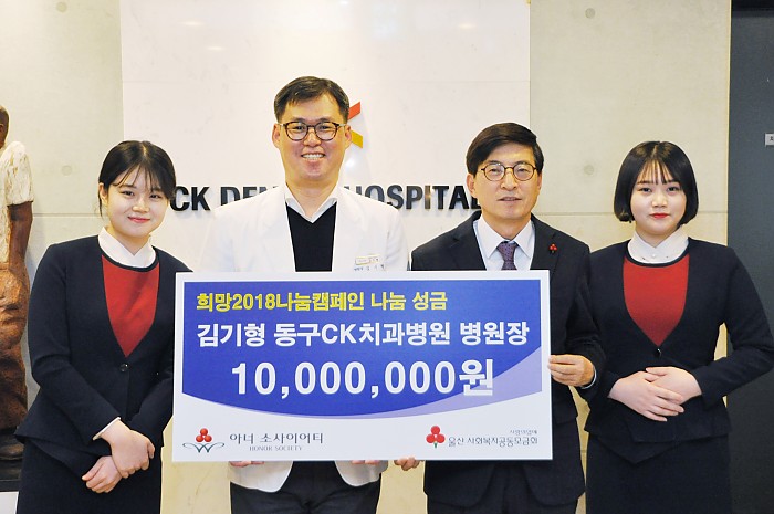 김기형 병원장님 희망2018나눔성금 전달2017년 12월 28일(목요일), 동구CK치과병원 김기형 병원장님이 사랑의열매 울산사회복지공동모금회에 이웃사랑 성금 1천만원을 전달했습니다.