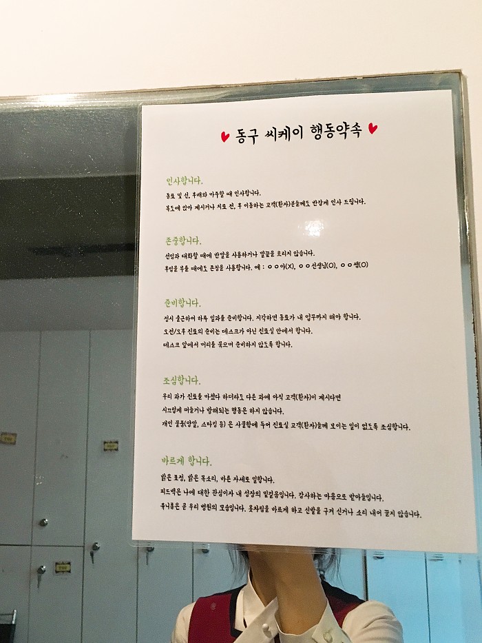 동구씨케이만의 행동약속을 만들어 함께 공유했답니다. 3월 2일부터 함께 하게 된 아홉 명의 막둥이 치과위생사 선생님들에게도 첫 사회생활에 도움이 되길 바라는 마음을 담아♡ 아침 진료준비 전 행동약속을 보며, 서로를 배려하고 아끼는 마음이 일상의 익숙함에 점차 바래져 희미해지지 않도록 날마다 새로이 다짐할 수 있길 바래봅니다. :D