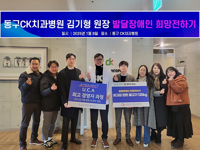 2025년을 맞이해 동구CK치과병원 김기형원장님이 발달장애인 희망전하기 봉사 사업에 동참하셨습니다. 울산광역시 지적발달장애인 복지협회 희망장애인 보호작업장과 사랑울타리장애인 주간보호시설에 최고급 한돈 불고기 125kg을 사비로 후원하시며 UCA 최고경영자과정 19기 원우들과 함께 전달식을 진행했습니다.