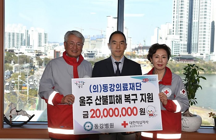이어 진행된 두 번째 전달식은 울산 동강병원에서 진행된 성금 전달식이었습니다. 이날 박원희 이사장님은 울산적십자사를 통해 산불 피해 복구 성금 2천만 원을 기탁하며, “갑작스러운 산불로 어려움을 겪고 있는 분들에게 도움이 되길 바란다”며 "산불 피해지역의 신속한 복구를 돕고, 이재민들과 함께 하는 동강병원이 되겠다."라는 뜻을 밝혔습니다. 채종성 원장님은 감사 인사와 함께 “소중한 기탁금이 실제 이재민들에게 따뜻한 희망으로 전달될 수 있도록 최선을 다하겠습니다.” 라고 전하며 나눔의 마음을 이어갔습니다.