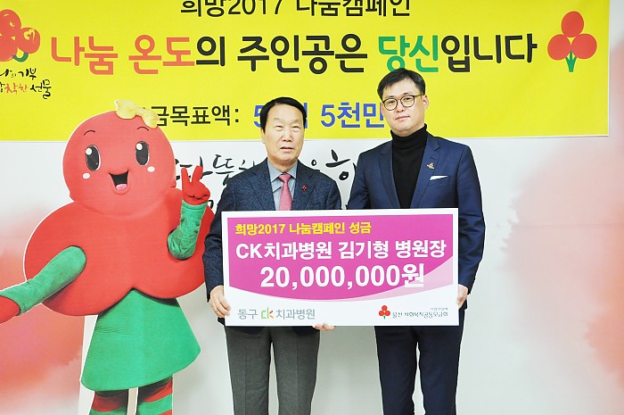 2016년 12월 14일, 동구CK치과병원 김기형 병원장님께서 울산 사회복지공동모금회에서 진행하는 "희망 2017 나눔캠페인" 성금으로 20,000,000원의 기부금을 전달하셨습니다.CK치과병원은 2011년 채종성 대표원장님께서 울산 사회복지공동모금회를 통해 아너소사이어티에 가입하신 것을 시작으로 김기형 병원장님을 포함, 모두 네 분의 아너가 소속된 전국 최초의 병원입니다.