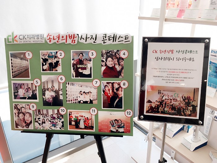 지금 동구CK치과병원에서는 CK가족들이 개원 10주년을 기념하는 송년의 밤에서 찍어온 유쾌한 추억들을 모아 사진 콘테스트를 진행하고 있어요~각 층 로비에는 후보작 총 12작품들이 전시되어 있구요~ 그 중 가장 고객님들의 마음을 사로 잡는 사진의 번호를 비치된 응모 용지에 작성해 응모함에 넣어주시면 됩니다. 투표해주신 고객님들께도 추첨을 통해 소정의 감사 선물을 드릴 예정이니 12월 27일까지 많은 참여 부탁드려요!!