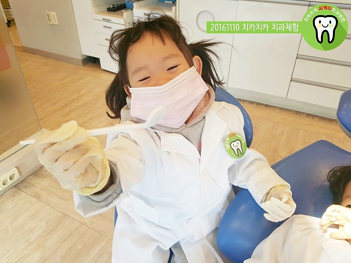 잇솔질 교육 후 3층 교정과 진료실로 내려가 마스크와 의료용 장갑을 착용하니 더욱 치과의사가 된 느낌! 친구들과 짝을 이루어 번갈아 가며 의사체험을 하기 시작했는데요~ 두 친구가 서로 치과의사 역할을 하고 싶다고 해서 동구CK 치과위생사 선생님이 대신 치과의자에 누워 환자역할을 하기도 했답니다.