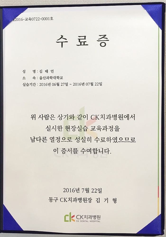 7월 22일 금요일 저녁, 동구CK치과병원에서 4주간의 실습을 성실히 수료한 실습생들을 위해 동구CK가 현장실습 수료식과 함께 수료증을 전달했습니다. ^^울산 과학대학교 김태언, 김효정, 박다영, 박혜란, 오하영 학생과 진주보건대학교 김주영학생까지 총 여섯 명의 실습생이 이 날 현장실습을 무사히 마쳤어요! 특히 동구CK치과병원 선배 치과위생사 선생님들께서 4주의 시간동안 예방검사, 트리오스 교육, X-ray 이론 교육 및 알지네이트 인상(본뜨기)과 각 부분별 실습 등을 교육, 실습생 학생분들이 치과에 대해 보다 다양하고 알찬 경험을 하실 수 있도록 도와드렸답니다~