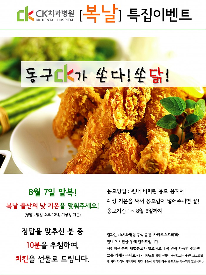 [동구ck치과병원 복날특집이벤트] 동구ck가 쏜다!쏜닭!무더운 여름, 내원해주시느라 고생 많으신 고객님들을 위해 동구ck가 '복날특집이벤트'를 시작합니다. (짝짝짝!!)