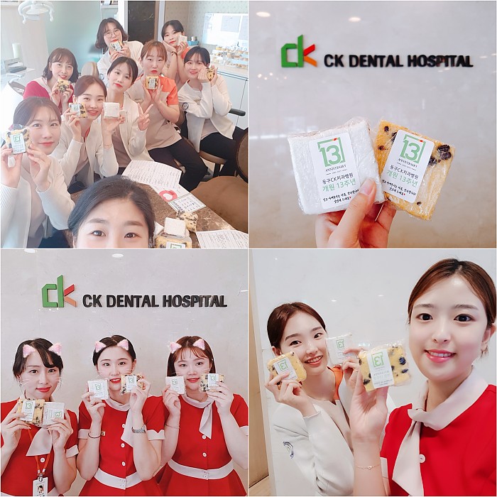 9월 16일, 오늘은 동구CK치과병원 개원기념일이에요! 올해로 벌써 열 세번째 생일을 맞이했습니다! (짝짝짝)동구CK치과병원을 늘 아껴주시고 찾아주시는 분들께 지난 13년 간 사랑해주셔서 감사하다는 의미로 아침 일찍 뜨근뜨끈한 생일떡을 준비했어요! 올해는 달콤한 꿀설기와 포슬포슬 맛있는 호박설기로 해보았답니다. ^^