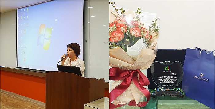 그리고 오늘을 마지막으로 조미영부장님께서 퇴사를 하시게 되어 감사의 마음을 담아 공로패를 드리는 시간을 가졌어요. 동구CK치과병원이 많은 분들께 사랑받는 치과로 성장하고 자리매김하기까지 이끌어주시고 다독여주신 조미영 부장님. 크리스탈처럼 매일이 반짝반짝 빛나는 삶을 이루시길 바라는 마음을 담아 선물도 함께 전해드렸습니다.