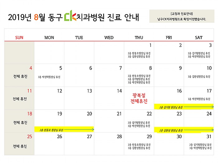 2019년 8월, 동구CK치과병원의 진료일정을 알려드립니다!여기를 클릭!하시면 크게 보실 수 있습니다.