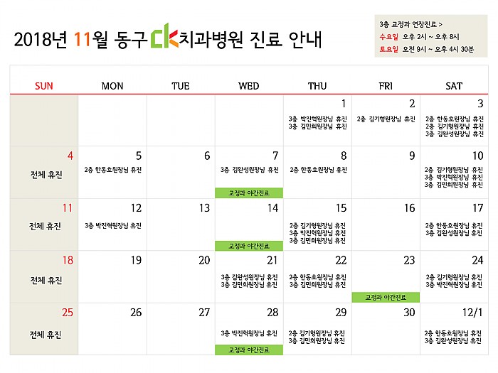 2018년 11월, 동구CK치과병원의 진료일정을 알려드립니다!김민희원장님 교정학회 참석 일정으로 인해 11월 21일~22일 휴진이며