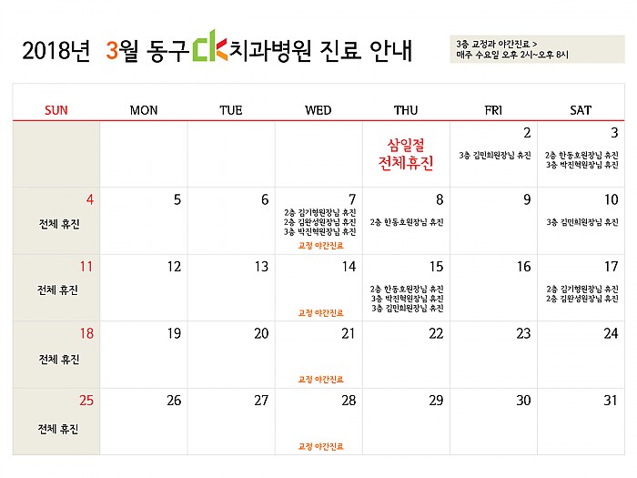 2018년 3월, 동구CK치과병원의 진료일정을 알려드립니다!19일 이후의 진료일정은 추후 다시 알려드리겠습니다. ^^