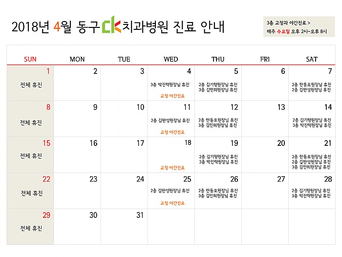 2018년 4월, 동구CK치과병원의 진료일정을 알려드립니다!(여기를 클릭하시면 크게 보실 수 있어요~)
