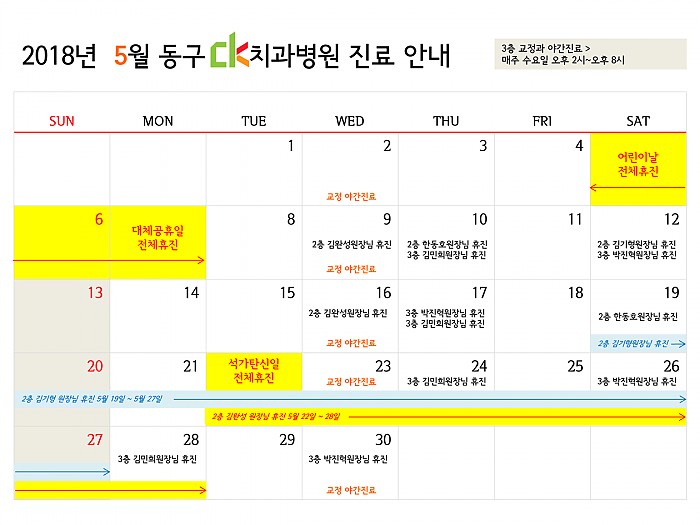 2018년 5월, 동구CK치과병원의 진료일정을 알려드립니다!근로자의 날인 5월 1일, 전체 진료입니다. (오후 6시 30분까지)
