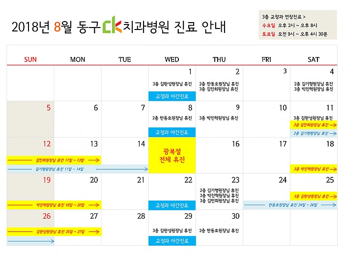 2018년 6월, 동구CK치과병원의 진료일정을 알려드립니다!8월 11일 ~ 13일 : 교정과 김민희원장님 휴진