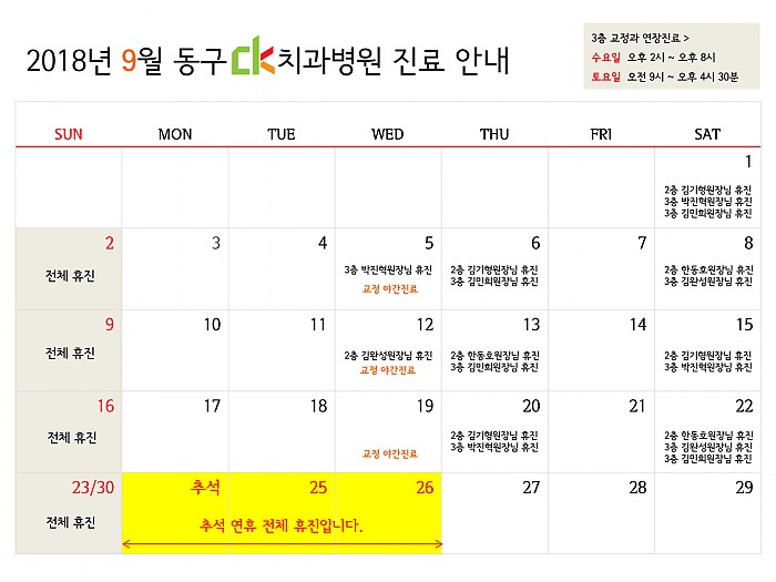벌써 가을이 다가오고 있네요~2018년 9월, 동구CK치과병원의 진료일정을 알려드립니다!