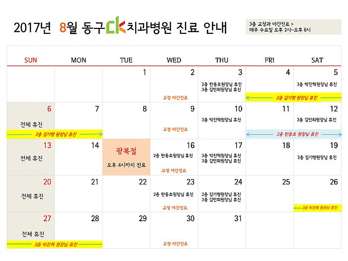 2017년 8월, 동구CK치과병원의 진료일정을 알려드립니다!(여기를 클릭하시면 크게 보실 수 있습니다.)