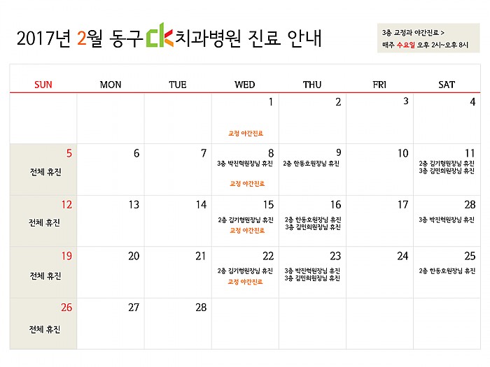 2017년 2월, 동구CK치과병원의 진료일정을 알려드립니다!(여기를 클릭하시면 크게 보실 수 있습니다.)