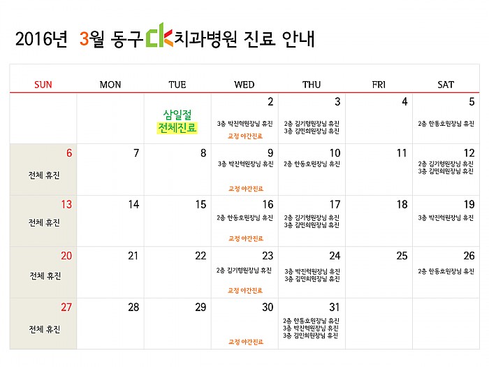 2016년 3월, 동구CK치과병원의 진료일정을 알려드립니다!(여기를 클릭하시면 크게 보실 수 있습니다.)