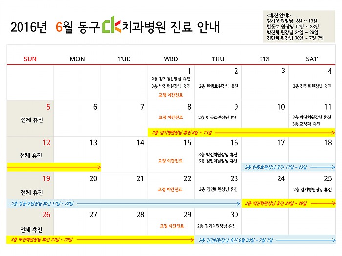 2016년 6월, 동구CK치과병원의 진료일정을 알려드립니다!6월은 동구CK치과병원의 하계 휴가가 있는 달이예요~