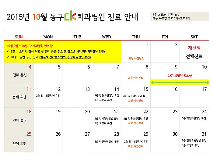 2015년 10월 동구 ck치과병원의 진료 일정 안내드립니다. ^0^(여기를 클릭하시면 크게 보실 수 있습니다.)
