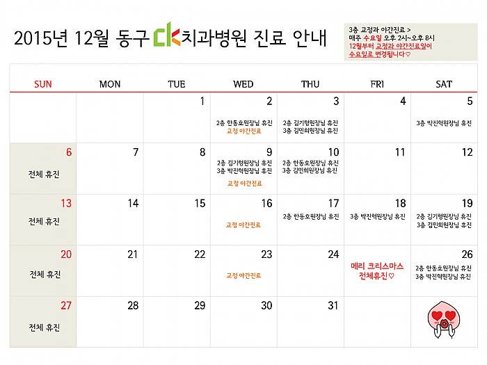 2015년 12월, 동구CK치과병원의 진료일정을 알려드립니다!