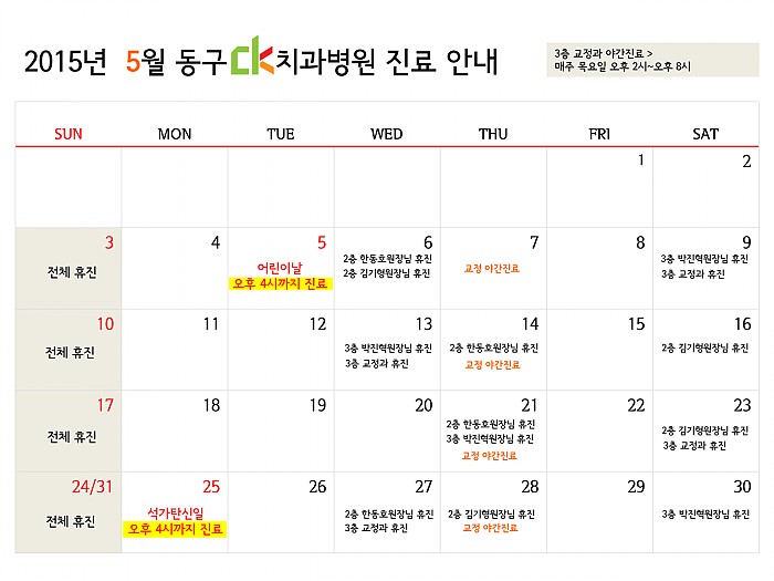 2015년 5월 동구 ck치과병원의 진료 일정 안내드립니다. ^0^(여기를 클릭하시면 크게 보실 수 있습니다.)