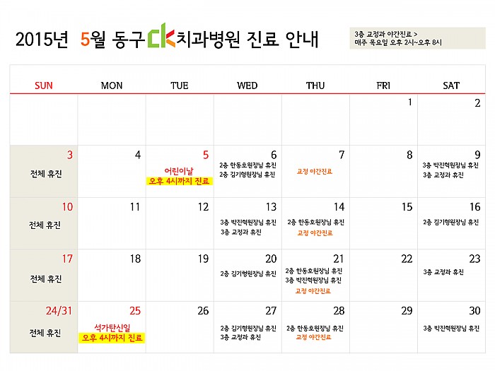 동구 ck치과병원의 5월 진료일정에 아래와 같이 변경사항이 있어 안내드립니다. ^^5월 20일(수) 2층 김기형원장님 휴진