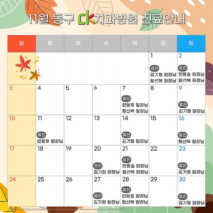 한동호 원장님 휴진일 : 11월 2일, 7일, 11일, 21일, 28일김기형 원장님 휴진일 : 11월 1일, 9일, 14일, 20일, 23일, 27일, 30일
