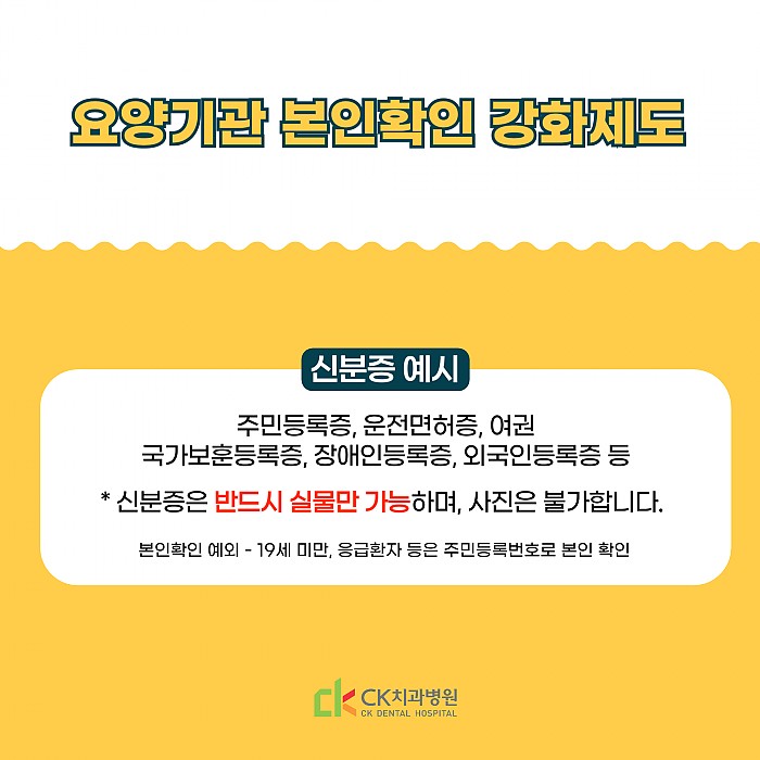 접수시 신분증 잊지 마세요!2024년 5월 20일부터 동구 CK치과병원에 내원하실 때에는 신분증 잊지 마세요!