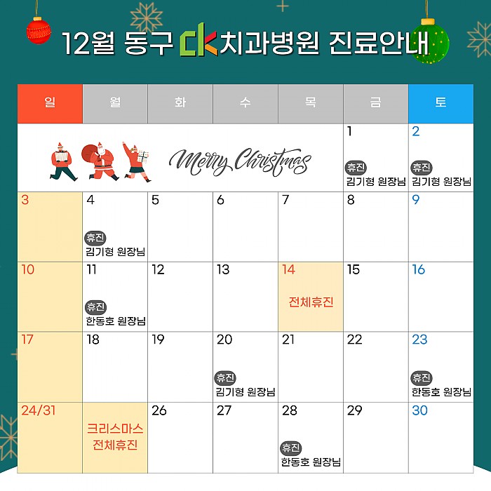 2023년 12월, CK치과병원 동구점의 진료일정을 안내드립니다.여기를 클릭!하시면 크게 보실 수 있습니다.