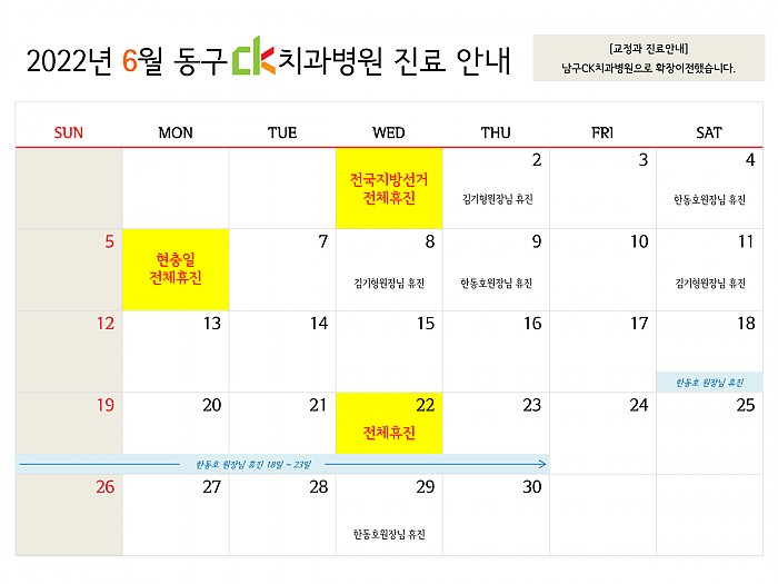 2022년 6월, 동구 CK치과병원의 진료일정을 알려드립니다.여기를 클릭!하시면 크게 보실 수 있습니다.