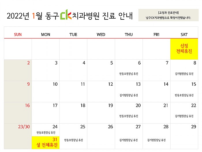 2022년 1월, 동구 CK치과병원의 진료일정을 알려드립니다.여기를 클릭!하시면 크게 보실 수 있습니다.