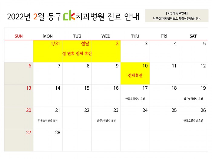 2022년 2월, 동구 CK치과병원의 진료일정을 알려드립니다.여기를 클릭!하시면 크게 보실 수 있습니다.