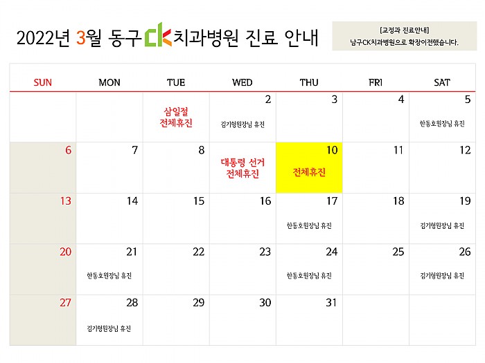 2022년 3월, 동구 CK치과병원의 진료일정을 알려드립니다.여기를 클릭!하시면 크게 보실 수 있습니다.