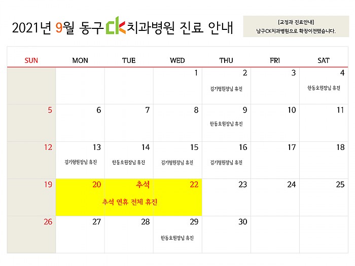 2021년 9월, 동구 CK치과병원의 진료일정을 알려드립니다.여기를 클릭!하시면 크게 보실 수 있습니다.