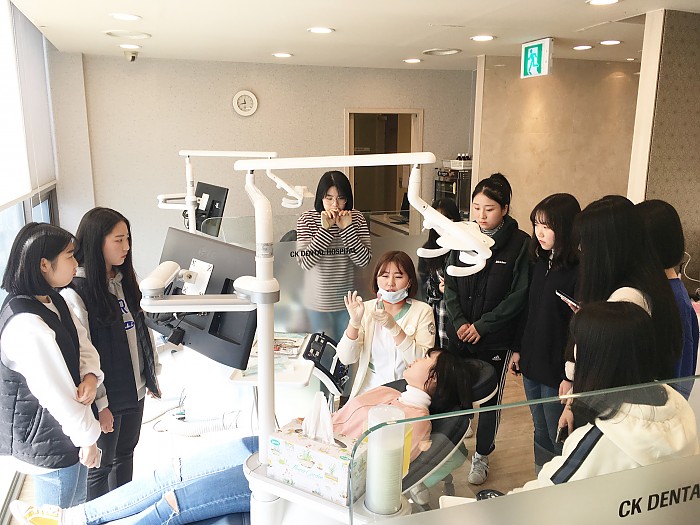 남목고, 화봉고, 방어진고, 효정고등학교 학생 19명이 직업체험학습을 위해 동구CK치과병원을 방문했어요!11월 17일 오전 10시부터 2시간 동안 진행된 이번 직업체험학습은 동구CK치과병원 예방팀에서 도와주셨는데요~ 정혜선팀장님이 치과에서 일하는 치과의사, 치과위생사, 치과기공사 등 여러 직업군에 대한 소개 및 올바른 입속 관리 방법에 대해 먼저 배워보았구요. 2층 진료실로 내려가 치과위생사 박지우 선생님과 함께 학생 한 명 한 명의 치태를 채취한 후 위상차현미경을 통해 실제 입속 세균에 대해 알려주는 시간을 가졌어요.