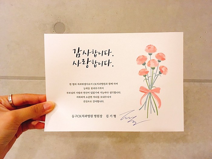 동구CK치과병원에 소중한 자녀분을 보내주셔서 감사의 마음을 전한다는 메시지 카드와 함께 친필 서명까지! 부모님 한 분 한 분을 위해 직접 챙겨주셨답니다!