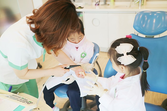 친구들과 짝을 이루어 번갈아 가며 의사체험을 하기 시작했는데요~ 두 친구가 서로 치과의사 역할을 하고 싶다고 해서 동구CK 치과위생사 선생님이 대신 치과의자에 누워 환자역할을 하기도 했답니다.