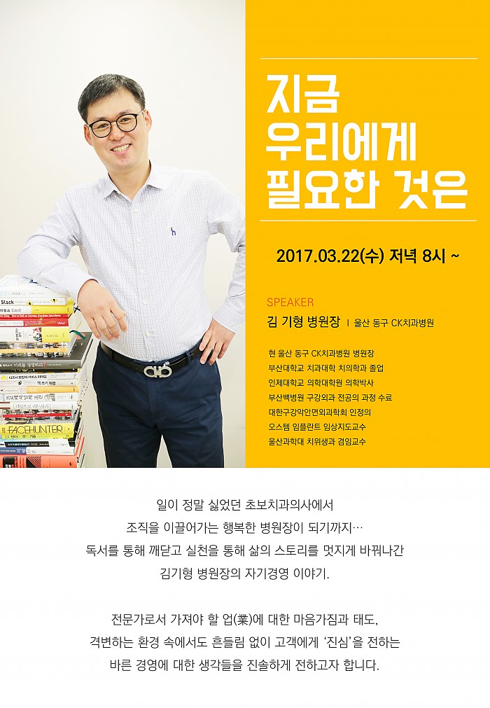 "지금 우리에게 필요한 것은..." 이라는 주제로 전문가로서 가져야 할 업(業)에 대한 마음가짐과 태도와 더불에 고객에게 '진심'을 전하는 바른 경영에 대한 김기형 병원장님의 생각들을 아낌없이 전하고 오셨어요~