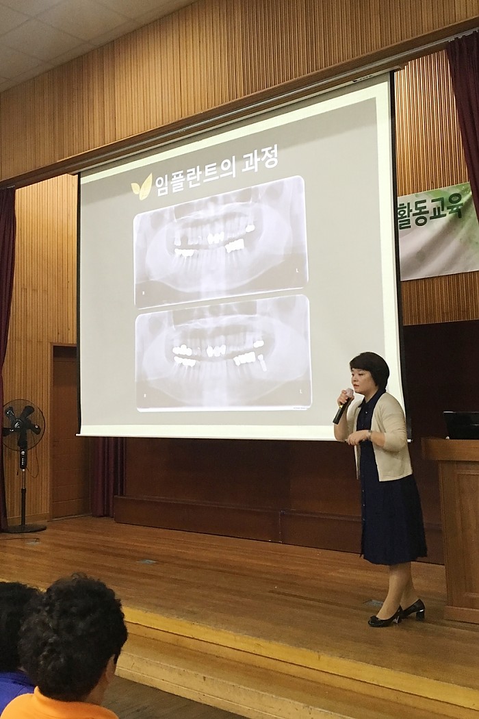 10월 12일 수요일 오후 1시, 울산광역시 남목2동 주민센터에 위치한 동구노인복지관에 조미영 진료부장님께서 특강 다녀오셨습니다!복지관 어르신 50여분을 모시고 임플란트&풍치(잇몸병)의 관리방법이라는 주제로 올바른 치과 정보와 더불어 평소 어르신들이 궁금해하셨던 점들, 입속건강 관리에 도움이 되는 좋은 정보들을 쉽게 풀어 알려주셨어요~
