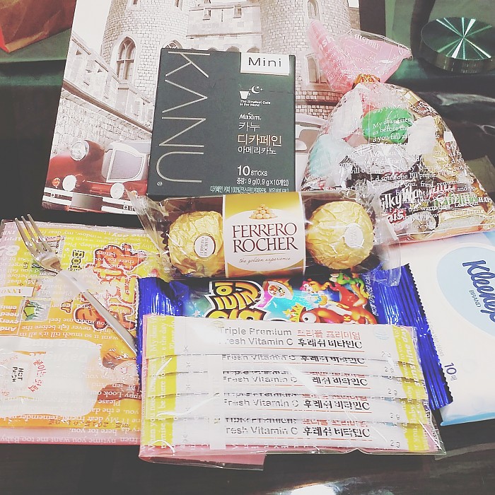 따숩게 시험치라고 핫팩, 두뇌회전을 도와주는 미니초코바와 사탕, 혹시 있을 헷갈리는 문제 잘 찍으라고 포크, 감기 조심하라고 비타민, 잘 풀라고 휴지(하지만 물티슈라는거 ㅋ), 따뜻한 커피 한잔으로 긴장 풀라고 카누(카페인 때문에 손 덜덜 떨지 않게 디카페인으로 ^^) 등등 한가득 바리바리 보냈어용~