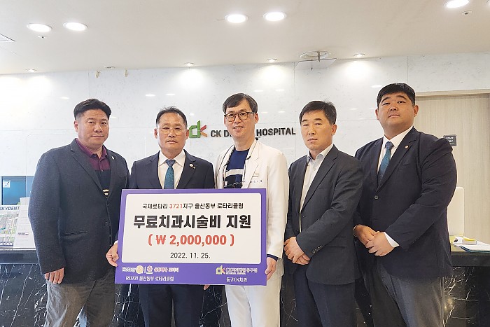 CK치과병원 동구점과 울산동부 로타리클럽이 치과치료비 지원사업을 다시 한 번 진행합니다.사정이 여의치 않아 치과 치료를 받지 못하고 계시는 동구 지역 취약계층들께 도움의 손길을 드리고 건강한 삶을 되찾으실 수 있도록 최선을 다해 돕고자 2022년 11월 25일, 동구 CK치과병원 3층에서 울산동부 로타리클럽 관계자분들과 함께 협약식을 가졌습니다. CK치과병원 동구점은 지난 2017년부터 울산동부 로타리클럽과 함께 치과치료비 지원사업을 함께 하고 있습니다. 앞으로도 지역 사회의 어려운 이웃을 위해 의술은 더하고 마음을 나누는 CK치과병원 동구점이 되겠습니다.