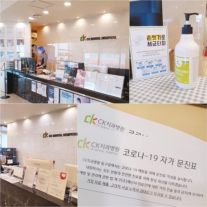 울산 동구 CK치과병원은 안전한 진료와 코로나19 감염 방지를 위해 다음의 노력을 기울이고 있습니다.1. 병원의 출입 동선을 1층 주차장 출입구로 제한하고, 내원객 모두의 마스크 착용 여부 확인 및 체온을 체크 합니다.