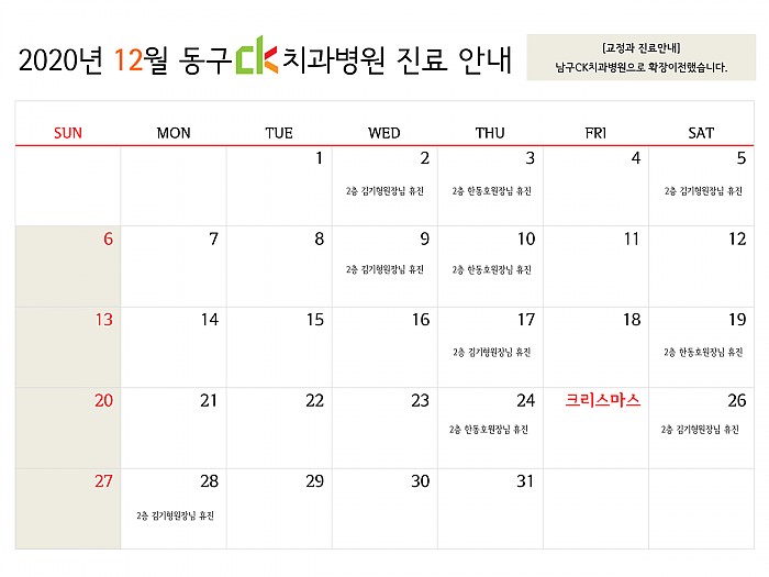 2020년 12월, 동구CK치과병원의 진료일정을 알려드립니다!여기를 클릭!하시면 크게 보실 수 있습니다.
