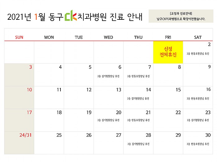 2021년 1월, 동구CK치과병원의 진료일정을 알려드립니다!여기를 클릭!하시면 크게 보실 수 있습니다.