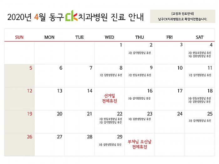 2020년 4월, 동구CK치과병원의 진료일정을 알려드립니다!여기를 클릭!하시면 크게 보실 수 있습니다.