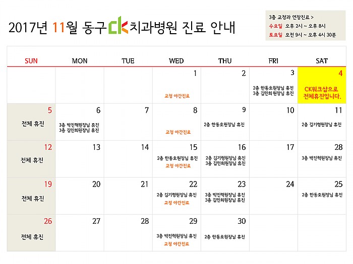 2017년 11월, 동구CK치과병원의 진료일정을 알려드립니다!* CK치과병원 워크샵 일정 안내