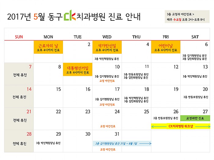 2017년 5월, 동구CK치과병원의 진료일정을 알려드립니다!5월의 황금연휴인 1일부터 9일까지, 동구CK치과병원은 오후 4시까지 전체진료합니다.